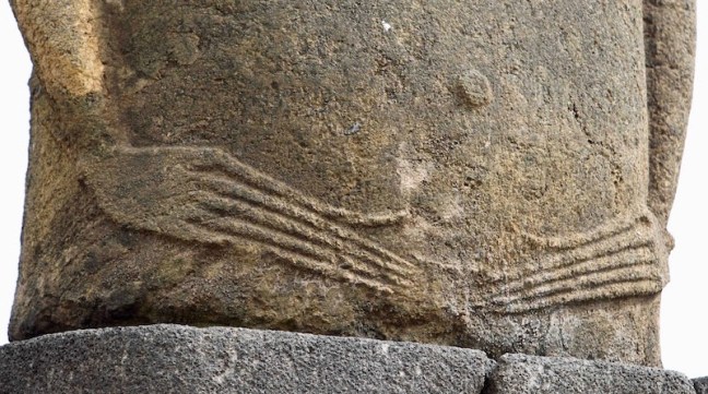 Many of the excavated Rano Raraku statues have a dorsal pattern of the same kind as that seen on several of the statues that had been toppled from their Ahu platforms. This pattern consists of an arched rainbow motif that is confined to the back. The descendants of the Long-ears claimed that the motif represented the rainbow with the sun and moon above it and rain symbolized by the “M” shape beneath. Heyerdahl states… “Once again it was obvious to us that images so artistically carved on all sides including the back could not have been subjected to the friction of being dragged along the ground.”