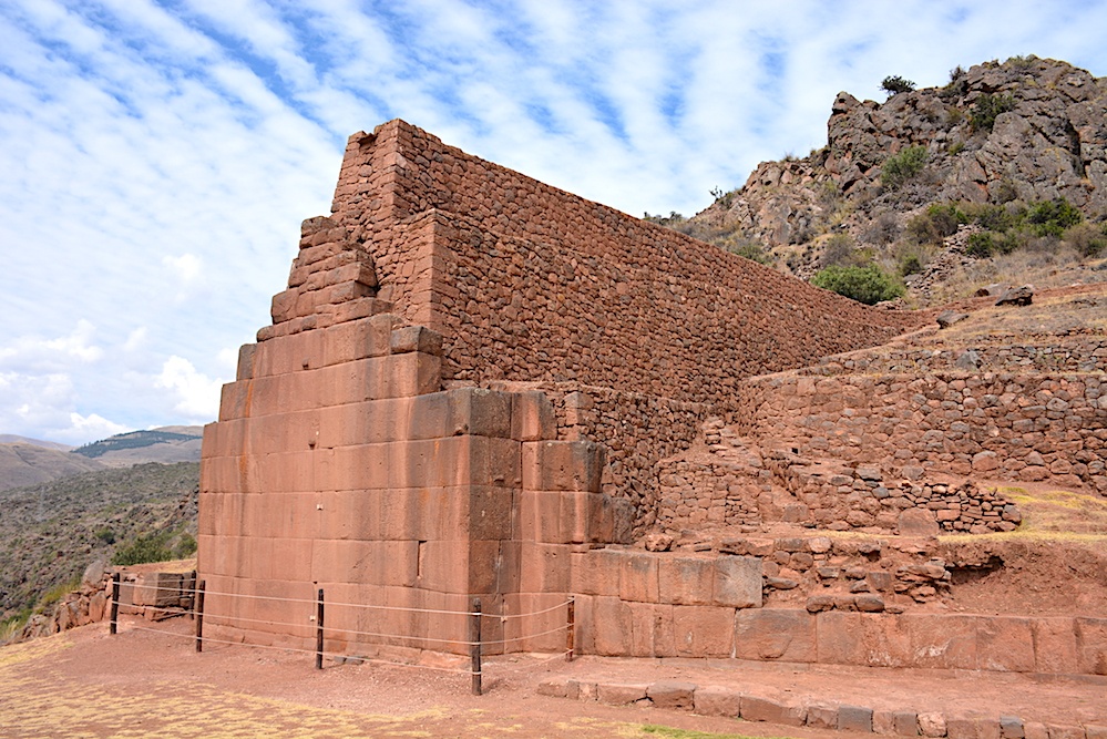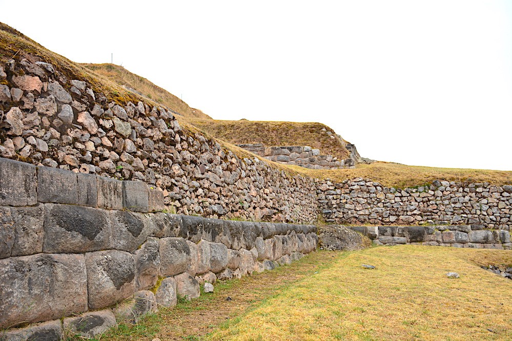 Lying north of Cusco sits the fortress of Saqsaywaman that is made of andesite walls that consist of interlocking blocks with the largest stones weighing as much as 125 tons. Each foundational stone goes about twelve feet underground, making the walls earthquake-proof. Notice the small rough stone & clay mortar style above compared to the mortarless megalithic stones below.