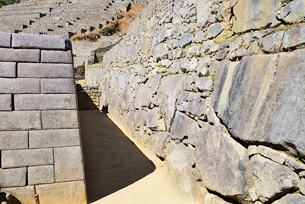 Notice below the striking difference between the small rough stone & clay mortar style wall on the right versus the superior megalithic wall on the left at Machu Pic’chu.