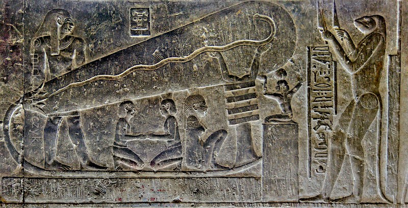 The Dendera light is a supposed ancient Egyptian electrical lighting technology depicted on three stone reliefs (one single and a double representation) in the Hathor temple at the Dendera Temple complex located in Egypt. 3 Upon examination, there is what appears to be a very large lamp or bulb with a cable connected at the end with a snake-like shaped cord inside. Compared with the smaller figures seen crouching below the lamp, are two giant looking figurines on each end of the lamp that some believe may depict an elite race of ruling class giants.