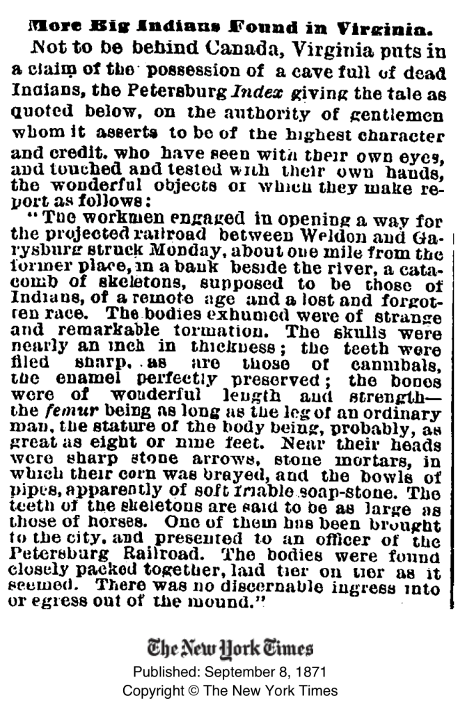 Virginia 1871: Catacomb of 8 Ft Skeletons with Filed Teeth Unearthed Posted on September 24, 2019 by Dee Olson A video narration of the 1871 New York Times newspaper article regarding the discovery of several ancient giant skeletons. Share this:TweetShare on Tumblr Click to email a link to a friend (Opens in new window) Email Related