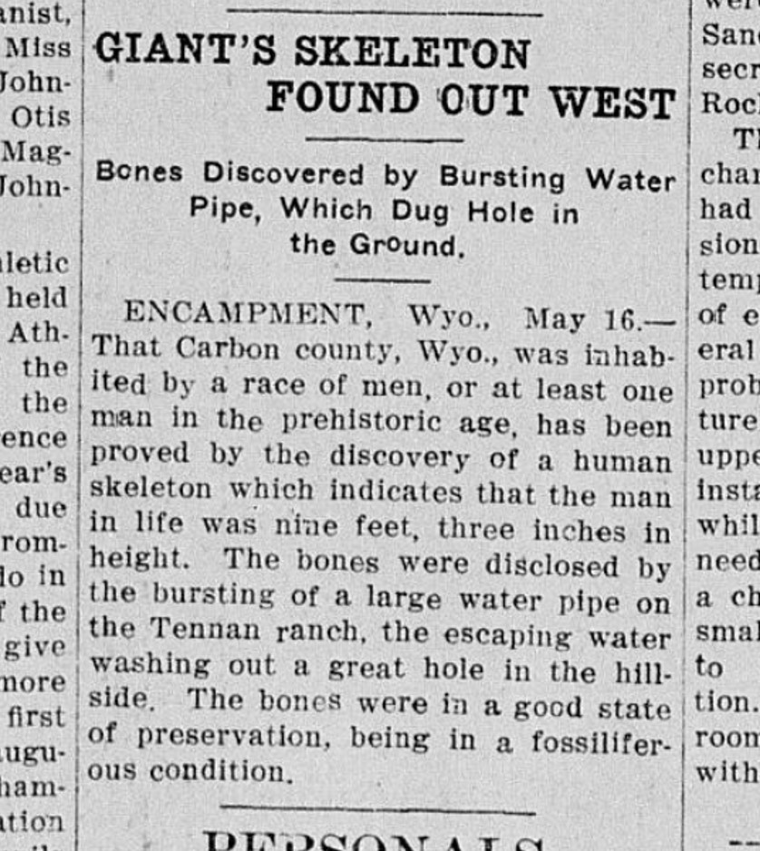 1910 Report: 9 ft Giant Skeleton Unearthed in Wyoming Posted on September 28, 2021 by Dee Olson Tour Info The Daily Gate City: May 16, 1910 Share this:TweetShare on Tumblr Click to email a link to a friend (Opens in new window) Email Related