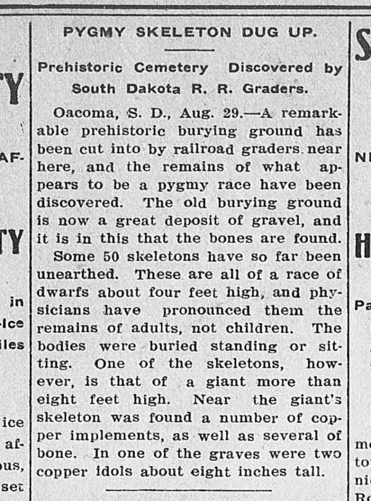 1907 Report: Giant Skeleton Found Amongst Cache of Dwarf Skeletons in South Dakota Posted on November 7, 2021August 24, 2022 by Dee Olson More Info The Billings Gazette: August 29, 1907 Subscribe to our Podcast Share this:TweetShare on Tumblr Click to email a link to a friend (Opens in new window) Email Related