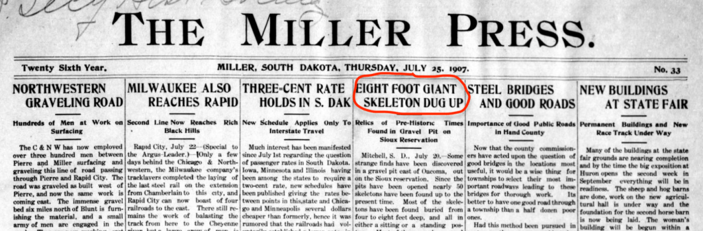 EIGHT FOOT GIANT SKELETON DUG UP: Relics of Prehistoric Times Found in Gravel Pit on Sioux Reservation