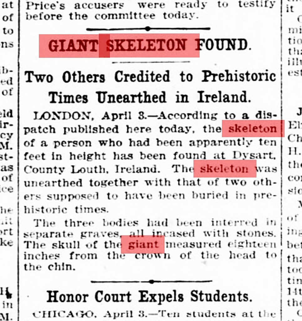 1914 Report: 10 ft Prehistoric Skeleton found buried inside Irish Stone Grave Posted on May 11, 2022July 30, 2022 by Dee Olson The Evening Star: Friday, April 3rd, 1914 Share this:TweetShare on Tumblr Click to email a link to a friend (Opens in new window) Email Related