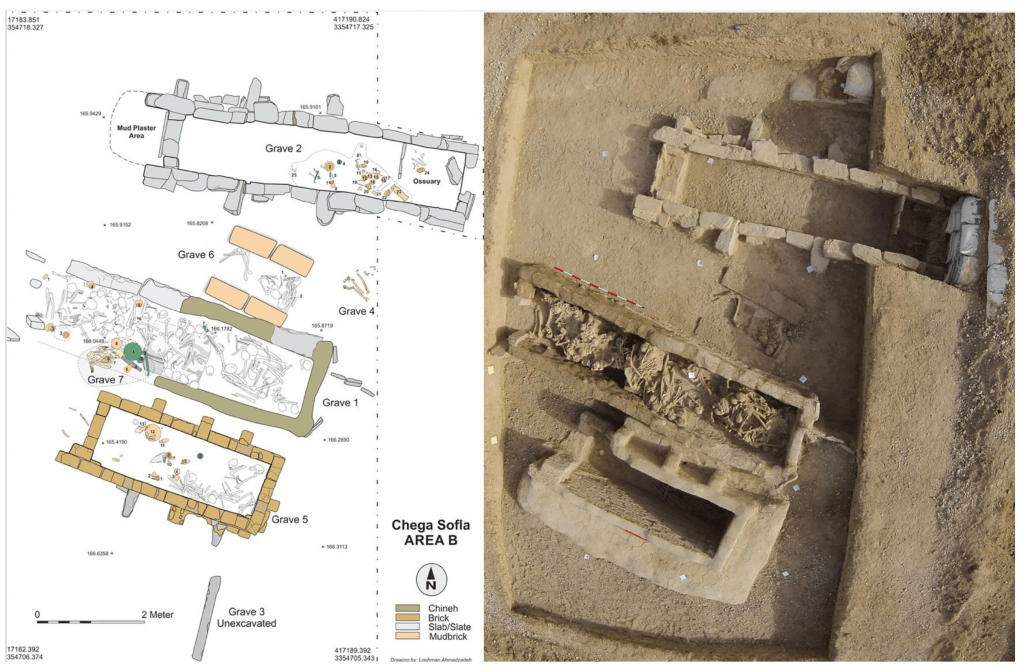 Archaeologist Abbas Moghaddam stated “Eleven graves, in total, were located within three excavation units named Areas A, B, and C. Three graves in area A (AG1, AG2, AG3), six graves in area B (BG1, BG2, BG4, BG5, BG6 and BG7) and one grave in area C (CG1) were excavated. Grave BG3 in area B remained un-excavated. Based on physical anthropology studies, the buried individuals in the ten excavated graves ranged in age at death between less than six years old to more than fourty years old. Most of them (21.3%) were aged between 30 to 35 years old and only a few were aged more than 40 years old (1.1%).” Moghaddam went on to say…
