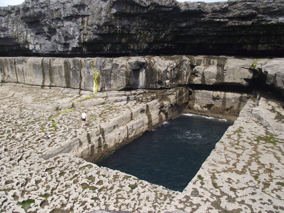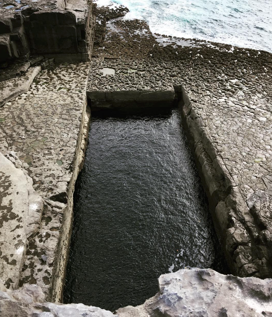 The Wormhole is a rectangular shaped pool cut straight from limestone floor, and can only be accessed by walking along the cliffs south of the ancient site Dún Aonghasa. The sea water ebbs and flows at the bottom of the cliffs and into the pool where the Wormhole begins to fill up, overflows, and then starts to drain. The process starts over and over again, and is said to be mesmerizing. 2