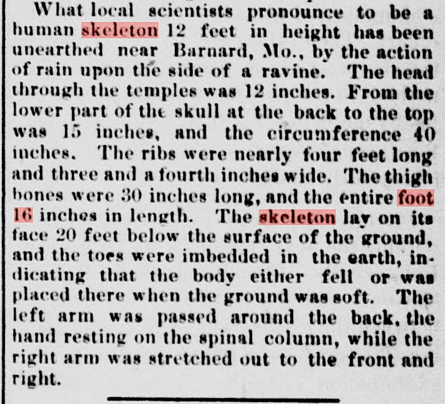 1883 Report: 12 ft Skeleton Unearthed in Missouri Posted on November 23, 2022November 24, 2022 by Dee Olson The Kenneber Journal: August 18, 1883 More Info Share this:TweetShare on Tumblr Click to email a link to a friend (Opens in new window) Email Related