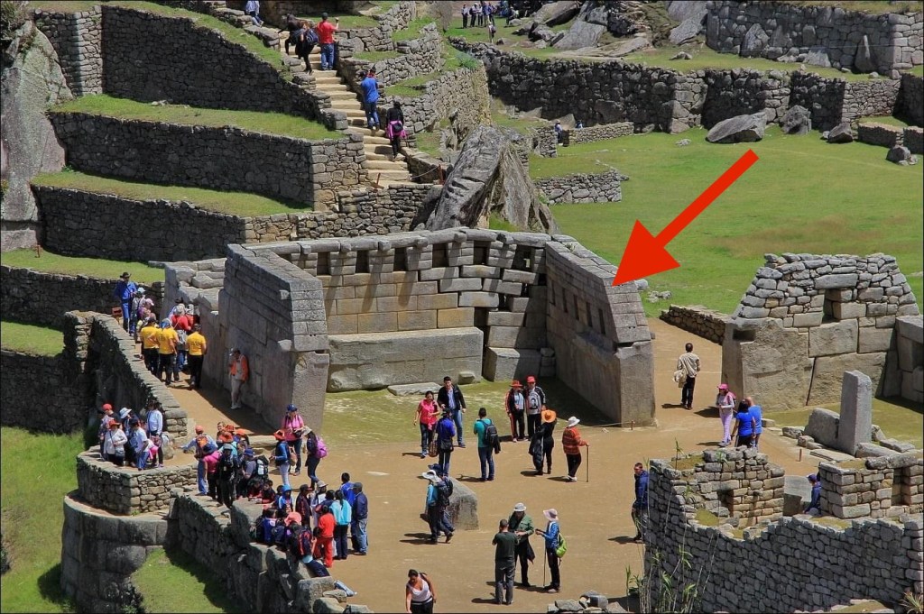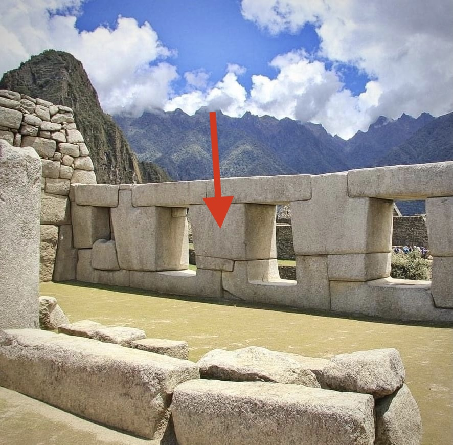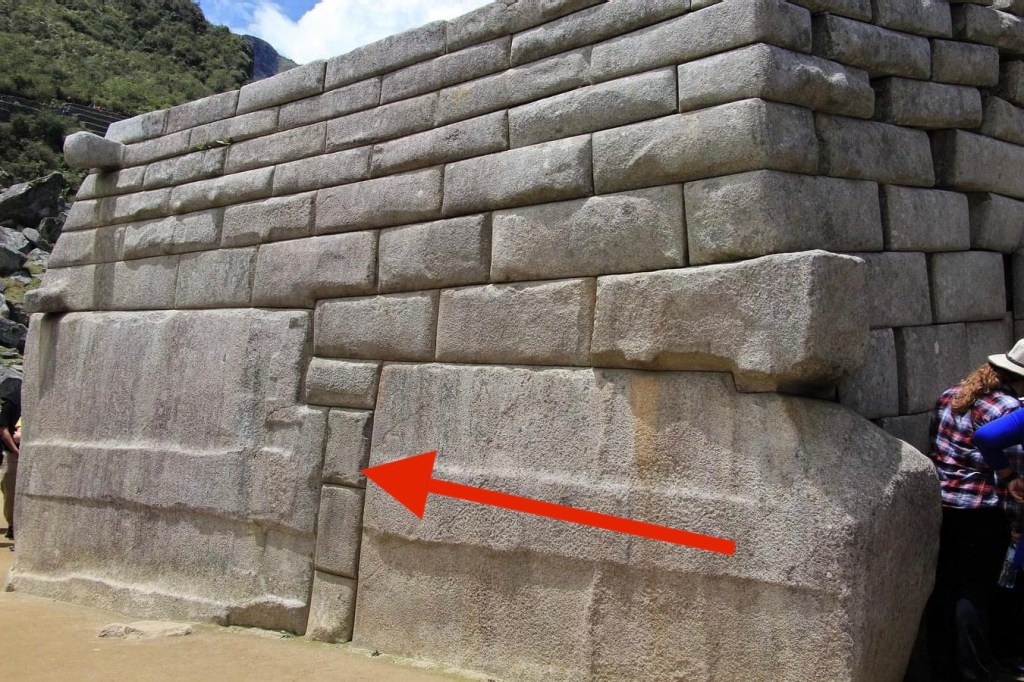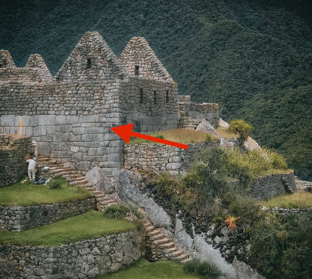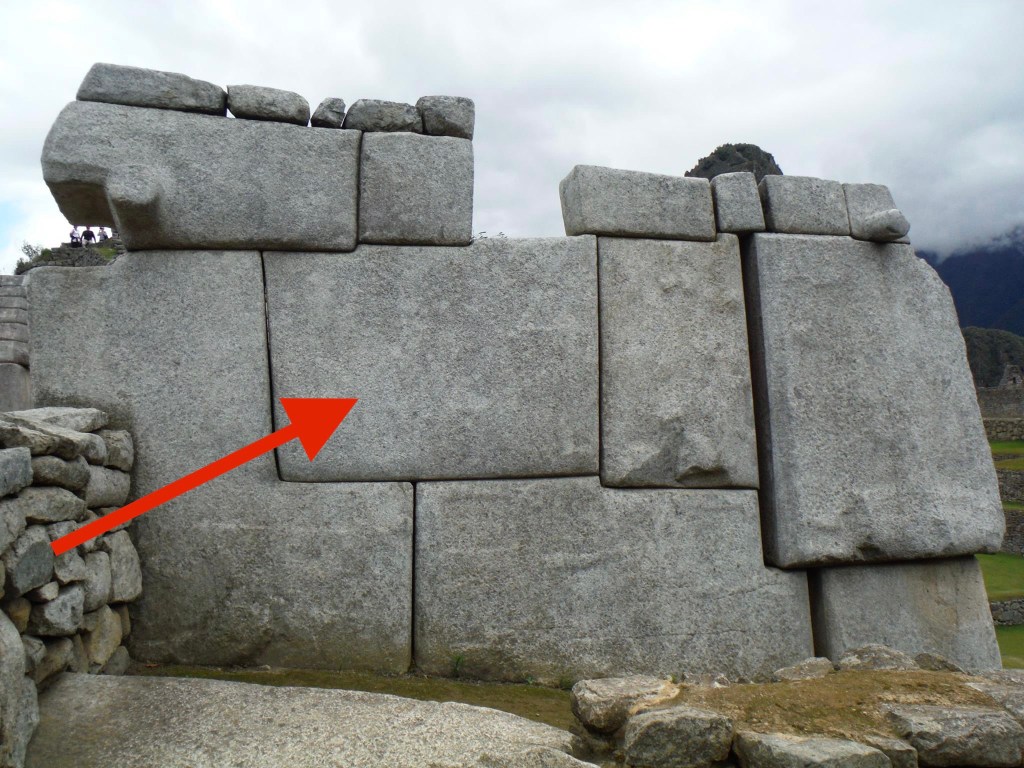 In the following photographs, follow the red arrows to see the precision white granite megalithic core of Machu Picchu. This megalithic core stands out in stark contrast to the small-rough stone construction that is built on top of and around it, which makes up approximately ninety percent of this site. Why are there two distinctly different architectural styles seen here?