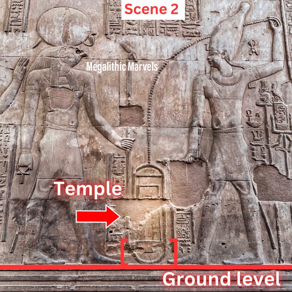 Scene three of this story is found on a different wall a bit further back inside Kom Ombo temple where Horus is depicted on the left side and the king on the right side. Now we can see that the temple gate has ascended high above the ground level from where it originally rested. Sadly again, this temple gate, which is the featured object in this scene has been badly damaged more than any other object that is depicted. Was this damage purposeful, so as to conceal the sacred knowledge of possible anti-gravity technology?