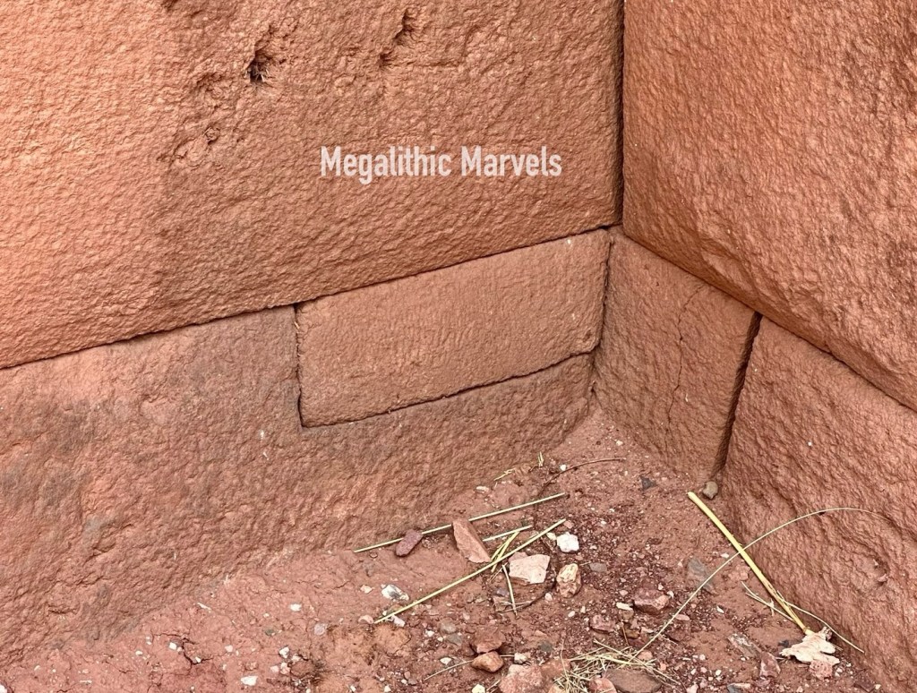 Vertical cracks running up and down on the mortarless remnants show evidence of ancient cataclysm.