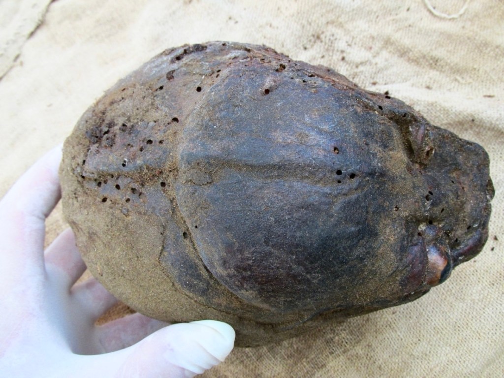Notice the gloved-hand in each photo holding the head as it provides scale indicating the head size. Also notice the head’s right side eye-ball that protrudes outward, as well as the deep crease-line that rounds the top-center of the head.