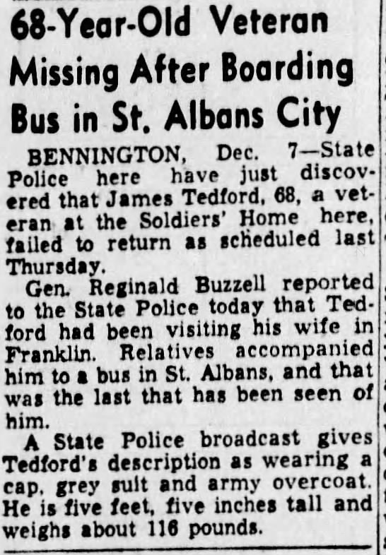Exactly 3 years to the day after the disappearance of Paula, on December 1st 1949, 68 year old military vet James E. Tedford is riding on a bus from the town of St. Albins back to his home in Bennington. The bus drives along route US 7, that will take James straight through the heart of the Bennington Triangle. The bus makes several stops along the way. According to reports, at the stop right before his, James apparently sees someone he knows standing outside at the bus stop. According to witnesses, James got off the bus to talk with his friend for about a minute and then got back on the bus.