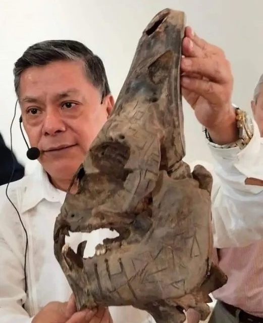 What is this? Mexican scientist Pablo Enrique Garcia Sanchez claims to have discovered this strange elongated skull, along with other artifacts, in a hillside mine near Taxco, Guerrero, Mexico in 2022.