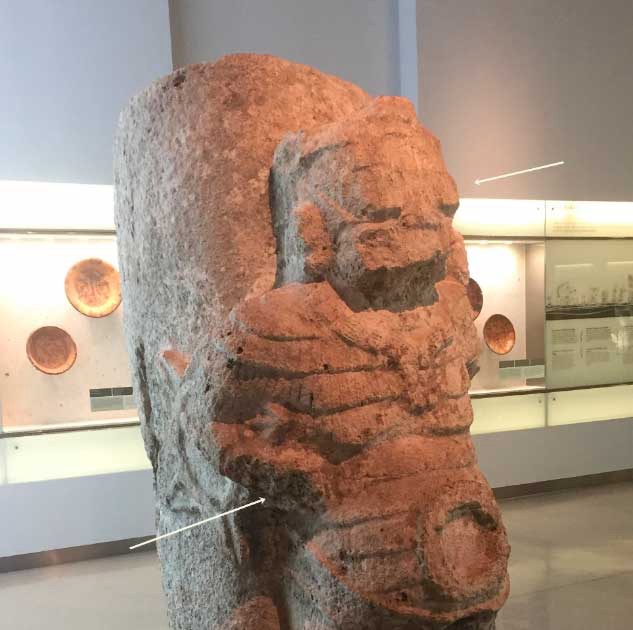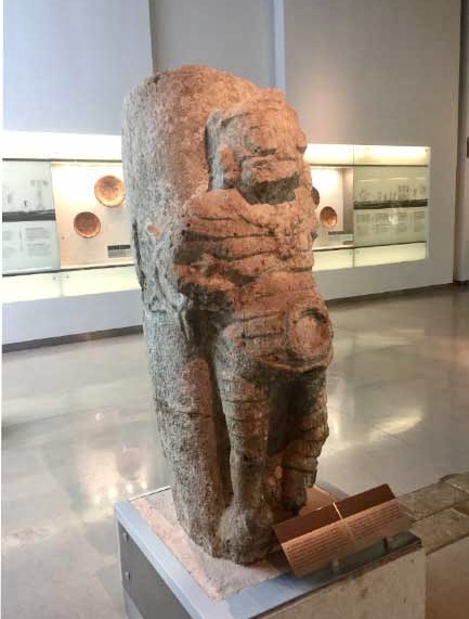 Of the two statues presented here, the large and distinctly clothed “Column 2”, has been moved to the Anthropological Museum in Mexico City, and the other, “Robot-head,” (left side) can be viewed at the Natural History Museum in Merida. Both wear armor or protective clothing and may represent soldiers, guards, or ordinary people in protective outfits.