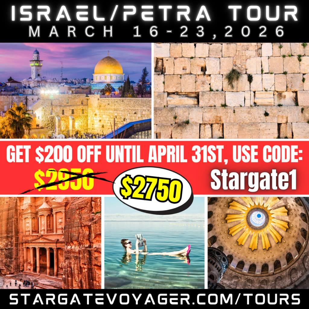 Join Derek Olson of “Stargate Voyager” and friends for the adventure of a lifetime on a Middle East expedition to explore the vast history and mysteries of ancient Israel and Petra. Experience the Bible come alive in 3D as we go to the Sea of Galilee where Christ walked on water, as we visit the “City of David” where King David ruled, as we behold the subterranean western wall tunnels to behold its massive megalithic foundations – this will be an Israel tour for the ages. Among all of the other major sites in Israel we will see – this will be an out-of-the-box tour where we will explore the area where the legendary “Watchers” are said to have descended on Mt Hermon, we will visit the habitation of their nefarious offspring the “Nephilim” & see the ancient archaeological ruins associated with them such as the “Gates of Hell” in Caesarea Philippi & the “Wheel of the Giants.” For those doing the Jordan extension, our journey will then take us to one of the seven world wonders – the mysterious rock city of Petra where we will explore its chambers and consider the ancient technology used to construct it. To see the detailed itinerary, and to register, please click the red button below to be redirected to our tour operator’s website.