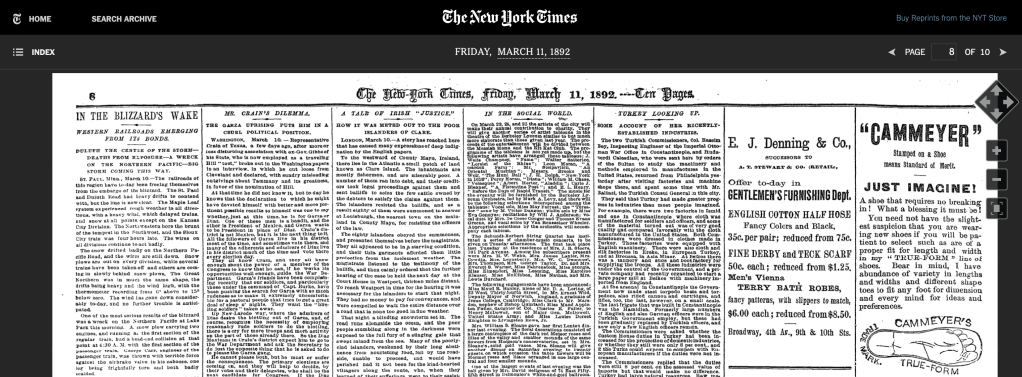 I came across this 1892 article while searching through the New York Times digital archives. Linked below is the original published article and screen shots of the newspaper