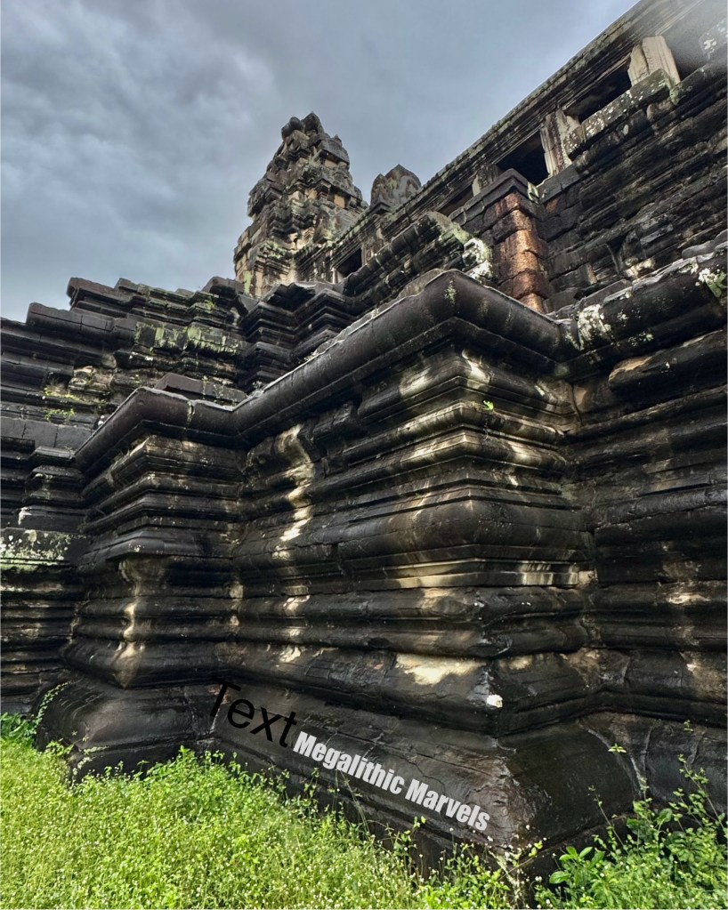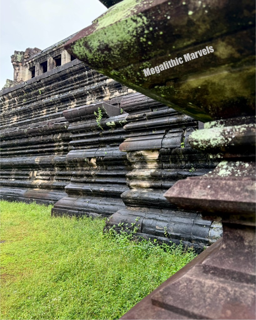When you take a step back and gaze at this site from afar, you realize that the temple sits on a massive black 20 foot tall 9 tiered precision sandstone base that looks far different and far superior to much of the construction that was built on top of it. The base and lower areas feature this air-tight mortarless engineering, whereas the higher temple areas and reclining Buddha built above are of inferior construction. This is similar to what we see in Peru in places like Machu Picchu, where the Inca built on top of the older, larger and superior megalithic granite core.
