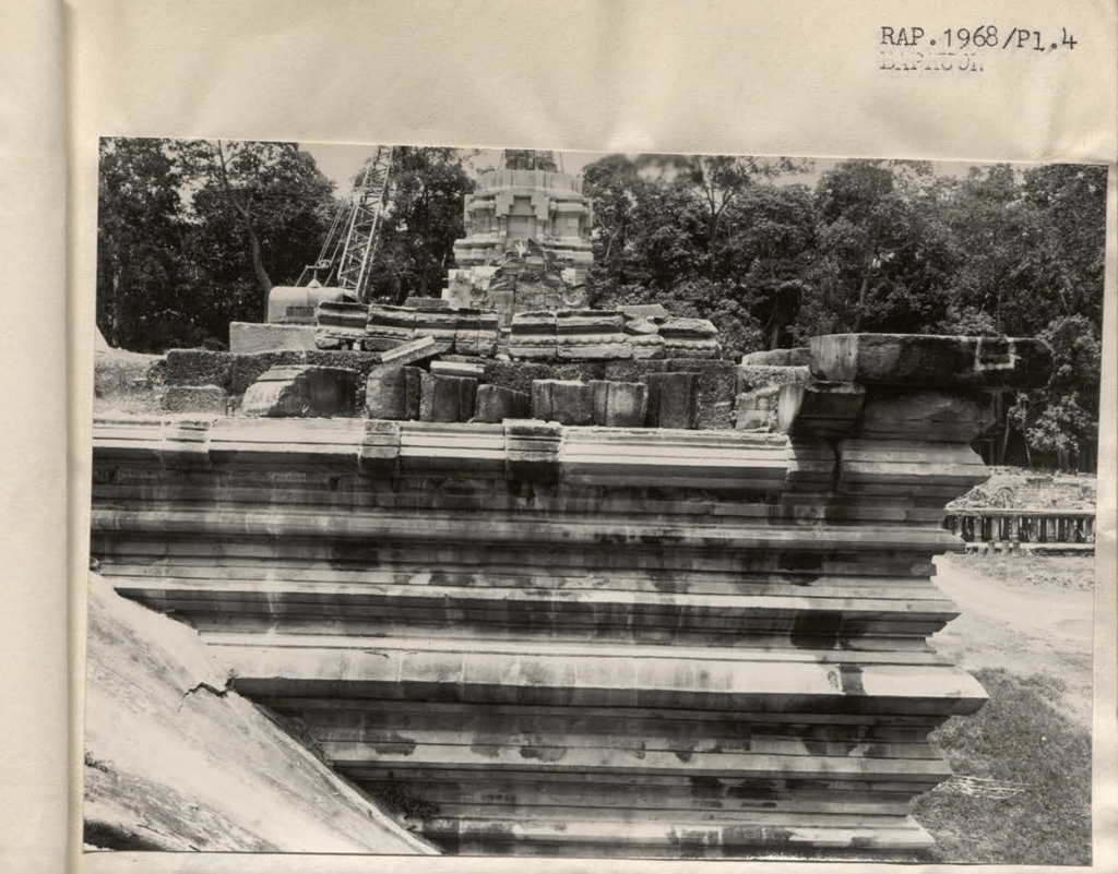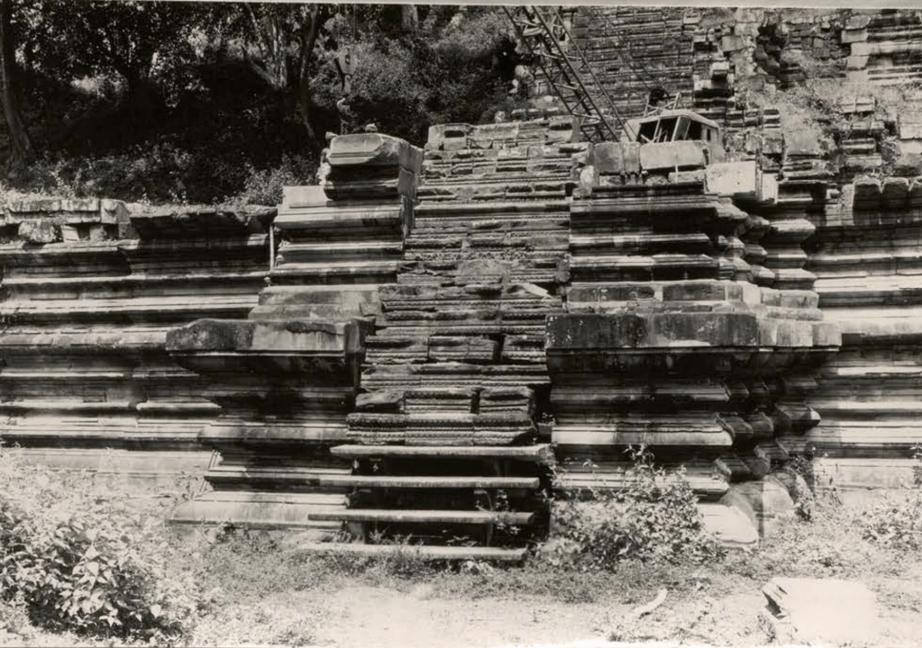 When Royere began work on the project in 1993, grass and jungle had grown over most of Baphuon’s blocks. He spent much of 1994 trying to figure out how to approach the complicated job. Royere stated “the archive of the numbering system (for scattered stones) was stolen and destroyed by the Khmer Rouge, so we had to face a kind of a jigsaw puzzle without the picture how to rebuild it. Reconstruction required measuring and weighing each block, as well as numerous drawings to figure out how each part fits. Each block has its own place. It can’t be replaced by another one because there’s no mortar between them and you will not find two blocks that have the same volume and the same dimensions.”