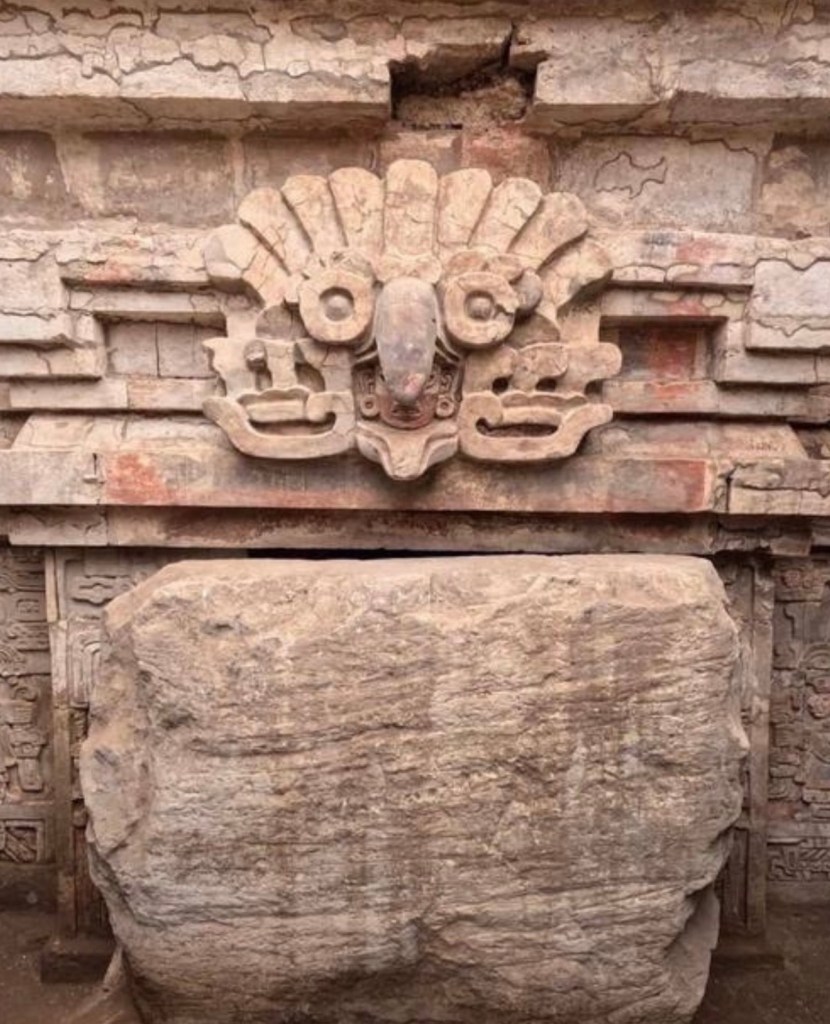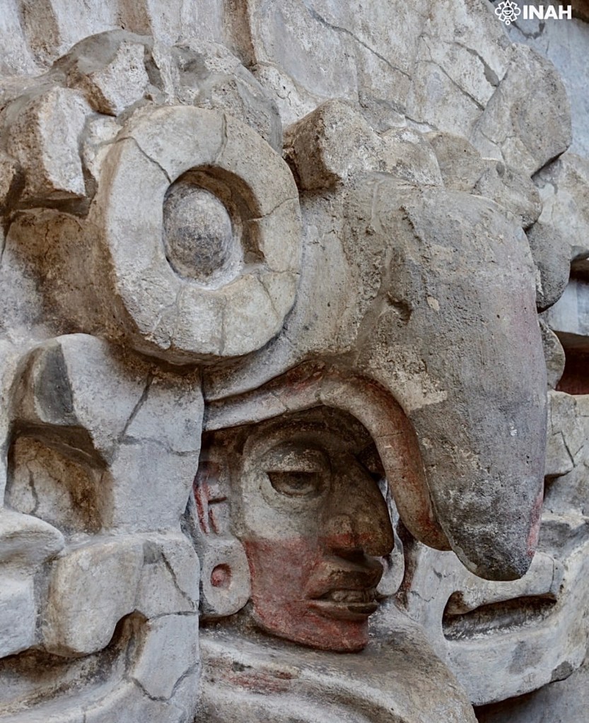 Colorful murals showing procession scenes, possibly linked to funeral rites or rituals were found as well as carved stone elements with calendar symbols and figures that may represent ancestral or protective beings.