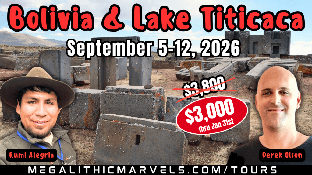 U.S. citizens can now enjoy visa-free entry to Bolivia, joining the list of 50+ other nationalities with simplified access. This thoughtfully designed tour includes the main tour focusing on the Lake Titicaca region of Bolivia and southern Peru, including Puma Punku and Tiwanaku, and an optional extension to Cusco and Machu Picchu afterwards. Hosted by Derek Olson of Megalithic Marvels and one of Peru’s most renowned tour-guides and historians Rumi Alegria, you will learn the forbidden history of Bolivia and southern Peru as we go in search of evidence of lost ancient technology. Not only will we see the most famous sites like Puma Punku and Tiwanaku, but we will take you off the beaten path to experience many hidden-gem megalithic sites that most tourists miss. This tour includes airport pick-up and drop-off, transportation, lodging, two meals per day, site tickets and English speaking guides. To see the detailed itinerary, and to register, please click the red button below to be redirected to our tour operator’s website.